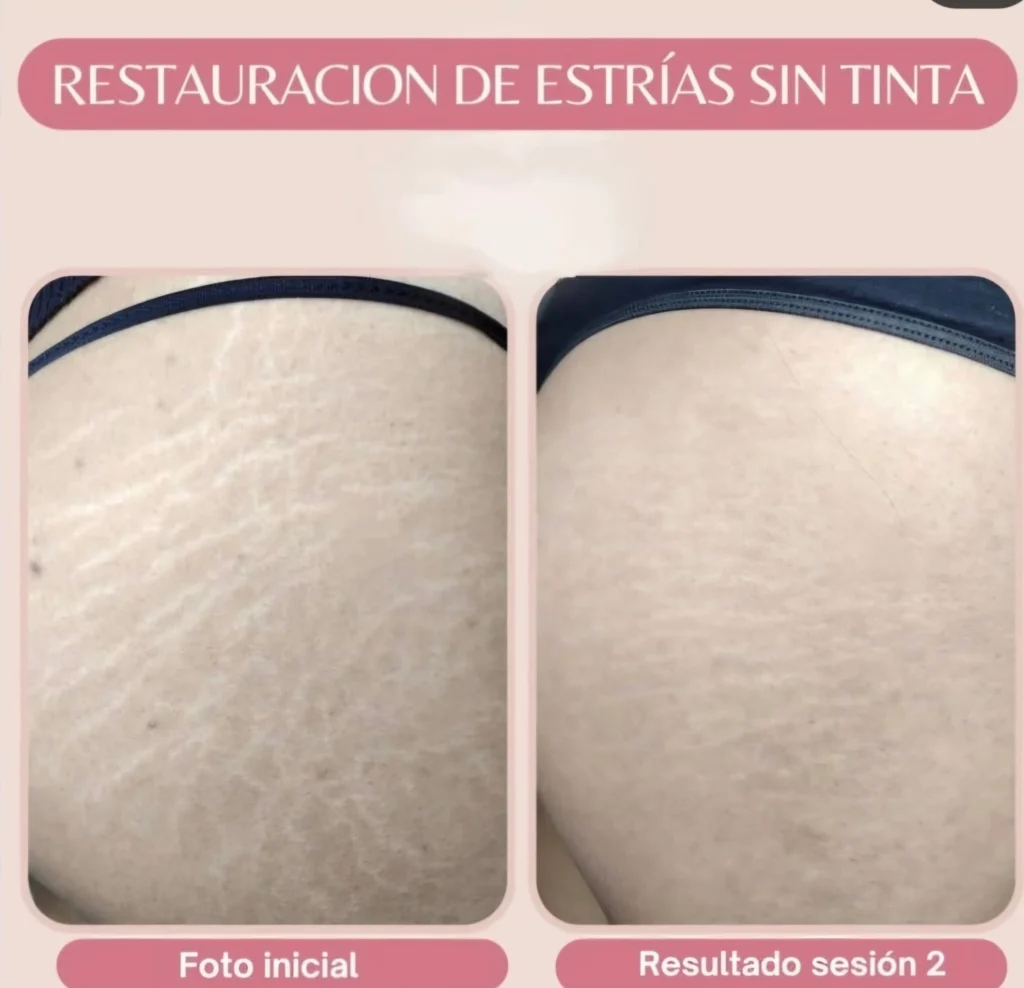 Restauracion de Estrías Sin tinta único. Tratamientos Cosmetologicos : Limpieza Facial con Peeling ultrasonico; Hidratacion intensiva; Sesiones de Alta Frecuencia en ACNÉ y Pediculosis; Sesiones de Revitalizacion facial con Radiofrecuencia. Masajes de Drenaje Linfático